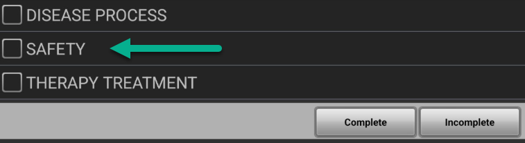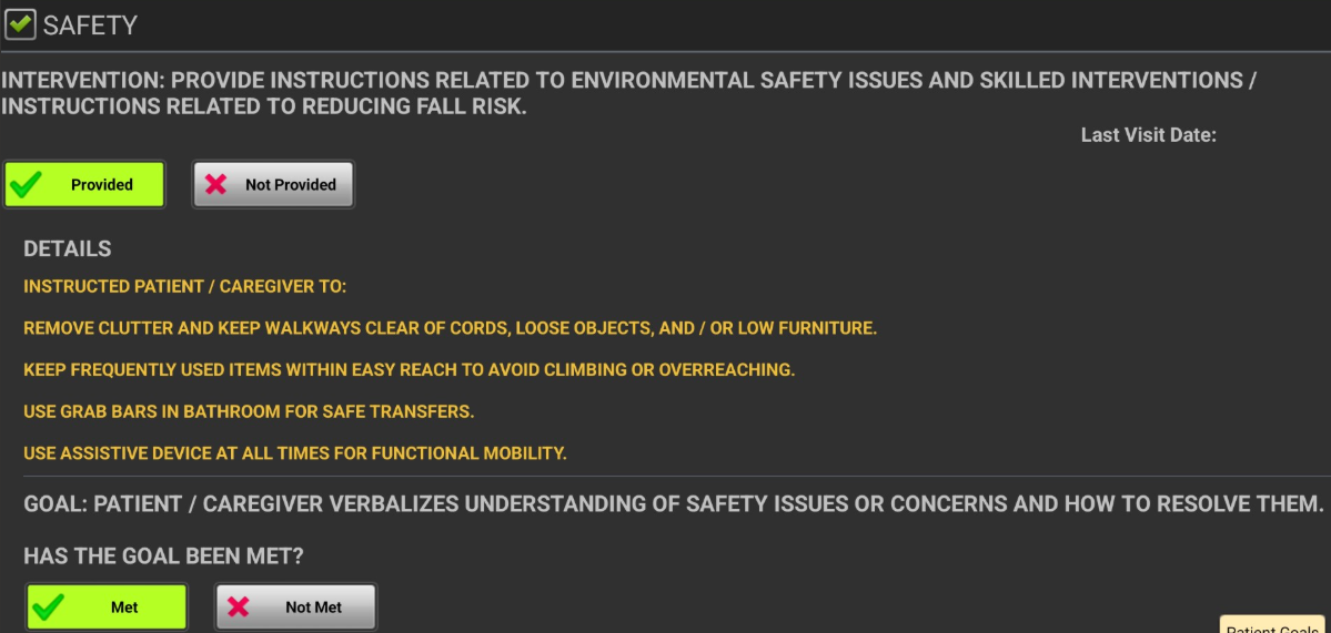 - Review the various categories in Interventions/Goals and proceed to document the skilled details and specific tasks that were addressed during that day’s Evaluation session. In this example, “Safety” is selected.