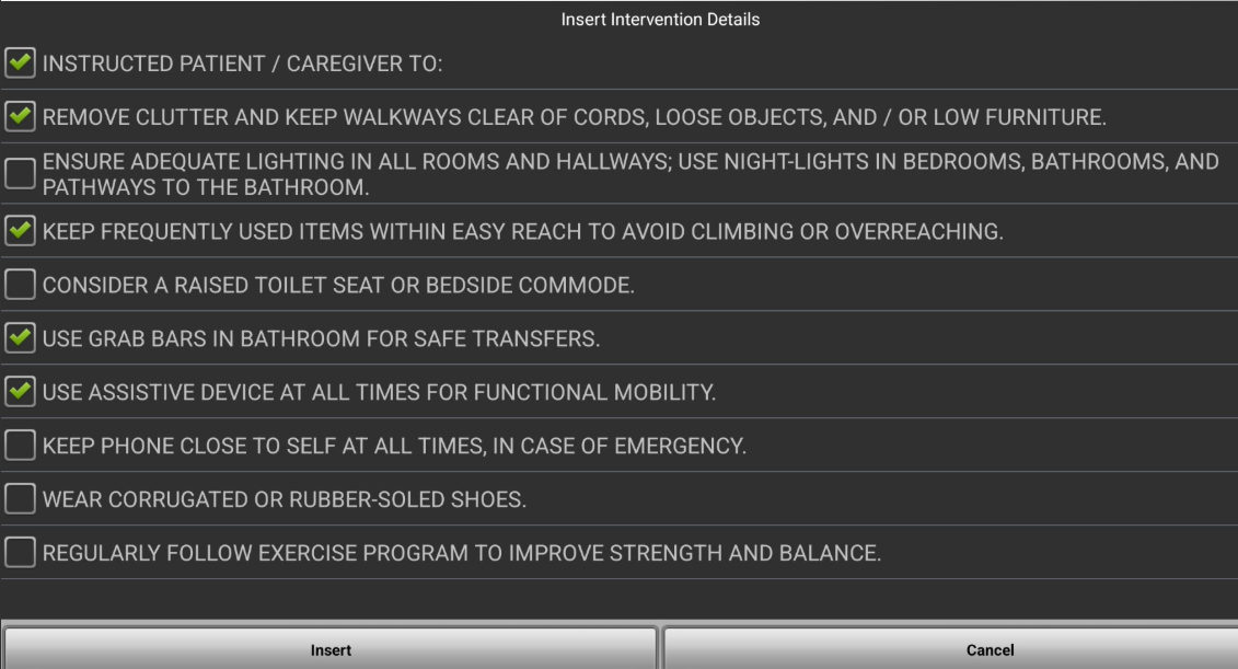 - Here is an example of 'Show Details' from the Safety Intervention, once chosen (green checkmark), the therapist can select 'Insert' to populate the free text area.