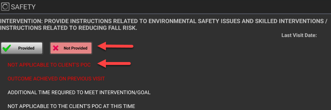 - At the Evaluation or SOC Visit, if the task is "Not Provided" be sure to select an option in RED which will ensure a 'red - red' (Not Provided - Not Applicable) pattern is followed so that this intervention does not proceed forward. This will ensure subsequent notes to not have irrelevant interventions and will also assist in avoiding duplicative documentation: