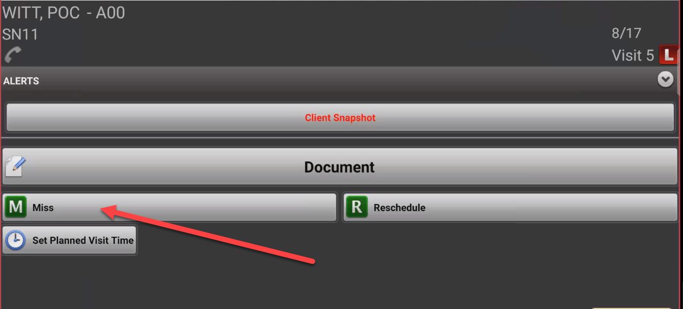 - In order to Miss a visit the visit must first be accepted- this will then give you the option to Miss the appt.