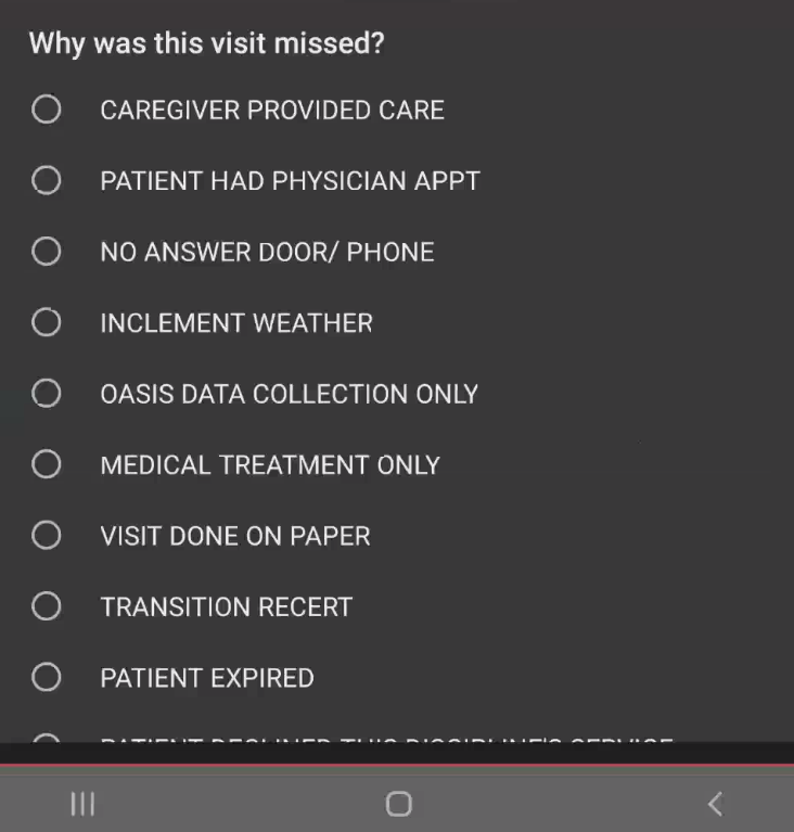 - Choose the reason that the visit was missed- scroll down to see all available options