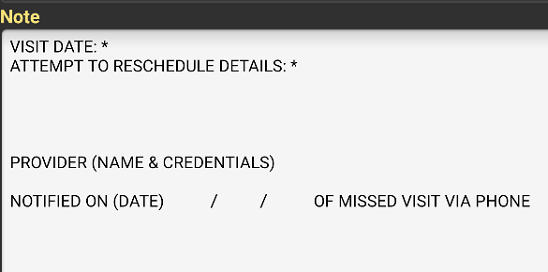 - Depending on the selection another screen will appear that will need to have the * removed and information in regards to the miss visit entered into office.